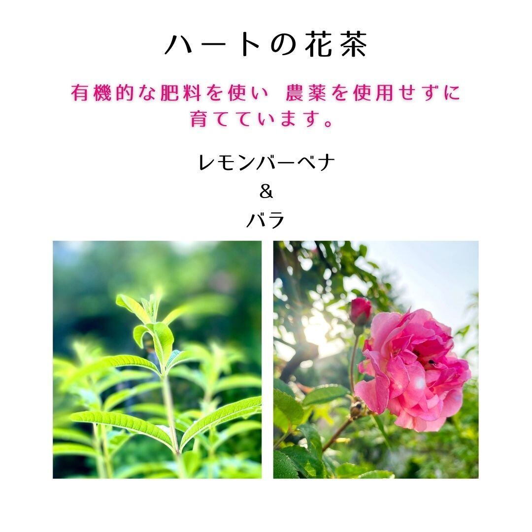 ハートの花茶【レモンバーベナ&バラ】は、れんげハウスの庭で年間を通じてガーデナーが育てている植物のみで作られたエディブルフラワーティーです。
