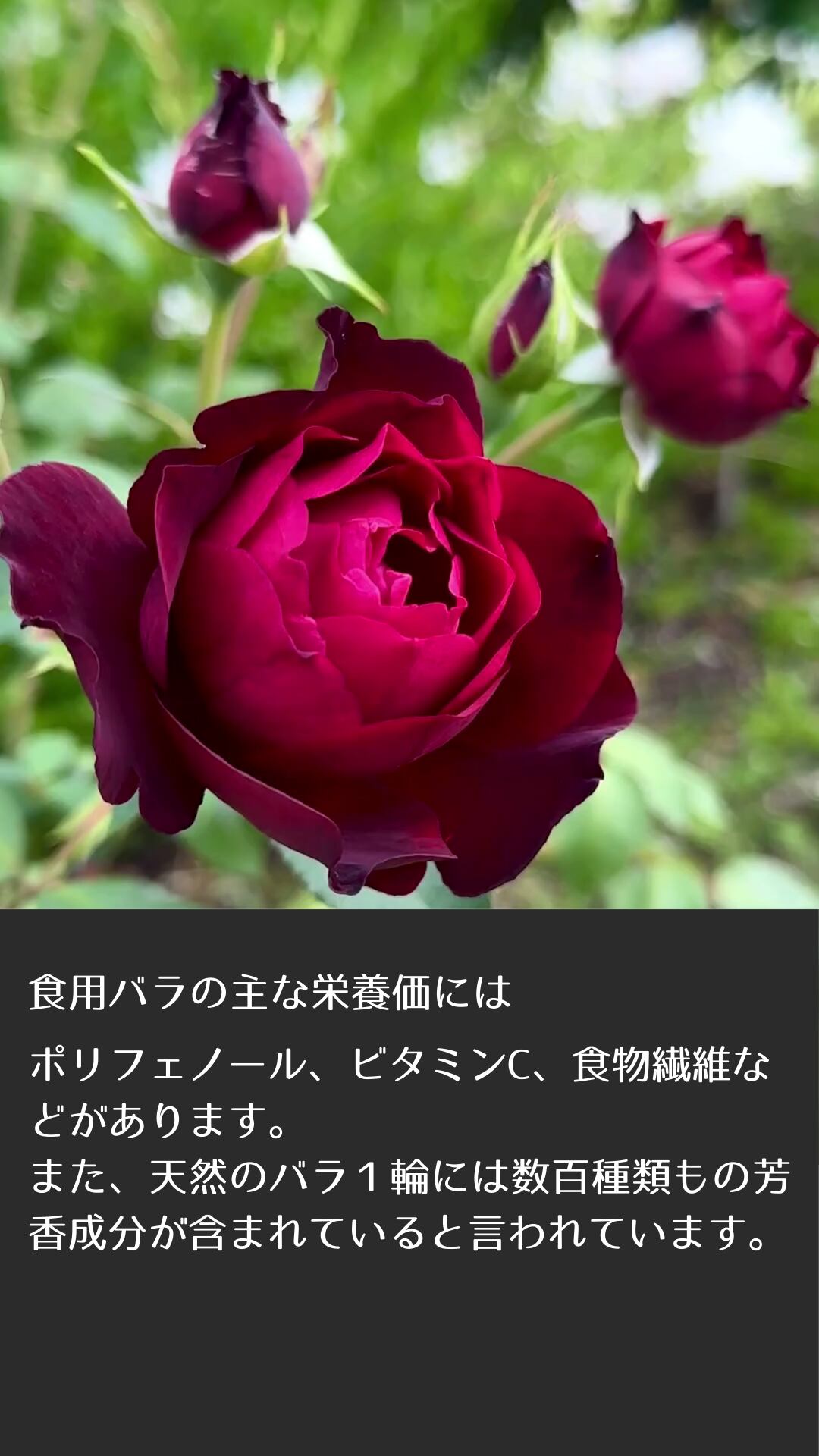 薔薇の歴史は古く、紀元前1世紀ころの古墳から5弁の薔薇、ロサ サンクタが発見されており、古代エジプトの人々は薬用として使ったと考えられています。 薔薇の花弁には、ビタミンA、ビタミンC、ポリフェノール、ケルセチン、ゲラニオールという成分が含まれるとされています。 レモンと同等のビタミンC、ポリフェノールがワインの約10倍、ケルセチンが玉ねぎの約2倍など、美容や健康にうれしい成分が多く含まれていると言われています。