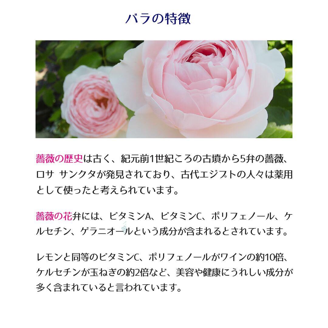 薔薇の歴史は古く、紀元前1世紀ころの古墳から5弁の薔薇、ロサ サンクタが発見されており、古代エジプトの人々は薬用として使ったと考えられています。 薔薇の花弁には、ビタミンA、ビタミンC、ポリフェノール、ケルセチン、ゲラニオールという成分が含まれるとされています。 レモンと同等のビタミンC、ポリフェノールがワインの約10倍、ケルセチンが玉ねぎの約2倍など、美容や健康にうれしい成分が多く含まれていると言われています。