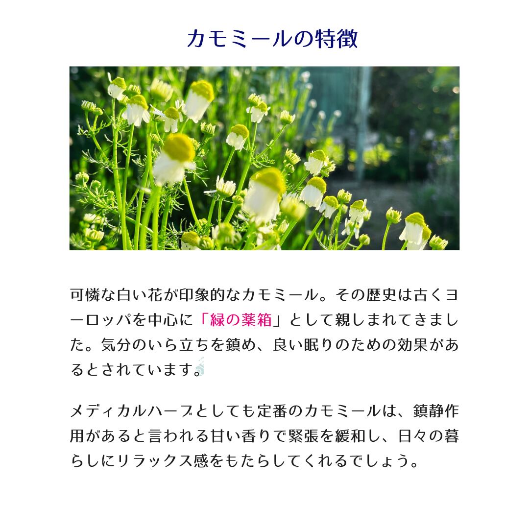 可憐な白い花が印象的なカモミール。その歴史は古くヨーロッパを中心に「緑の薬箱」として親しまれてきました。気分のいら立ちを鎮め、良い眠りのための効果があるとされています。 メディカルハーブとしても定番のカモミールは、鎮静作用があると言われる甘い香りで緊張を緩和し、日々の暮らしにリラックス感をもたらしてくれるでしょう。